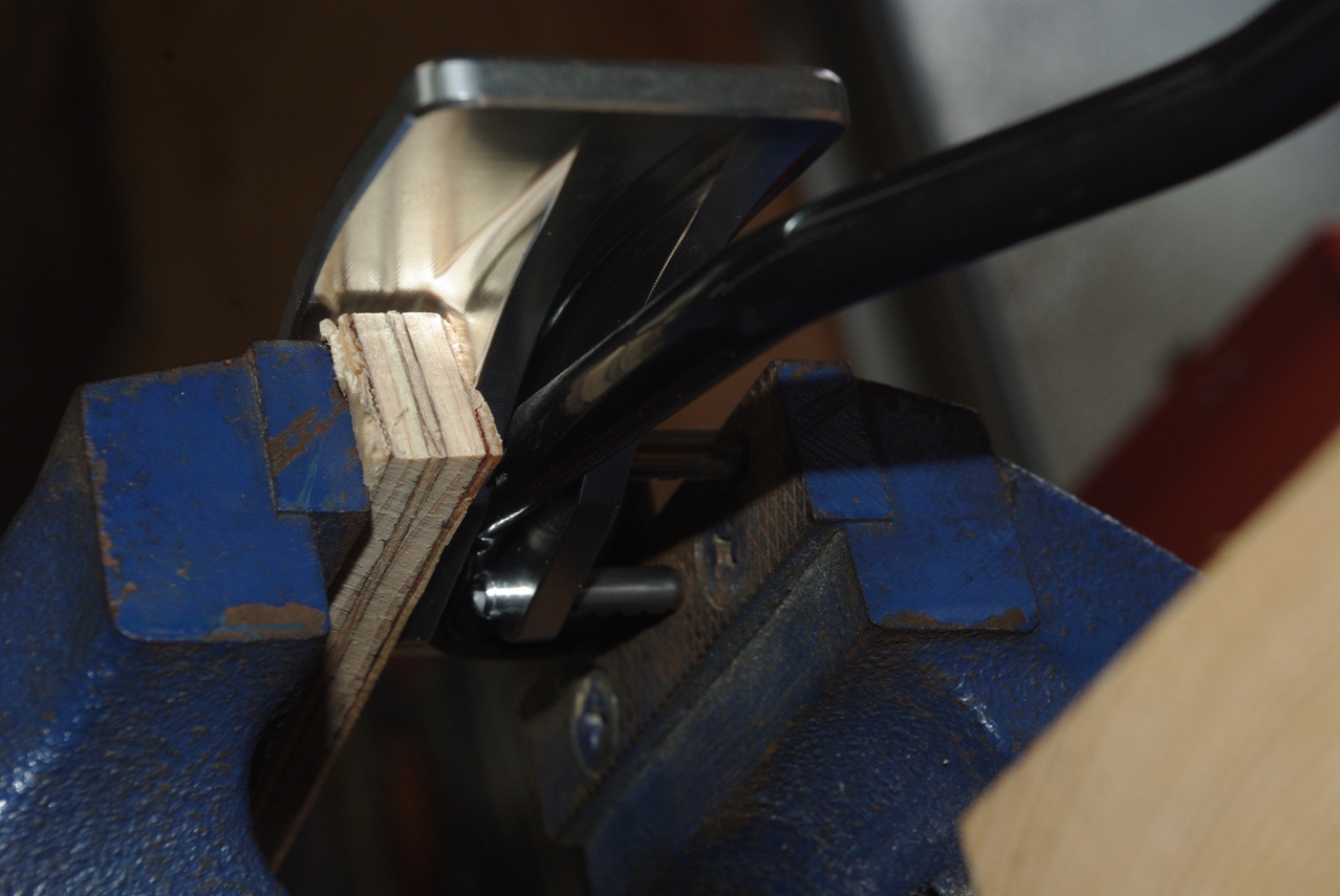 コンパネの端切れを反対側にあてがって、アクセルペダルNEO本体に万力が直接触れないようにしました。