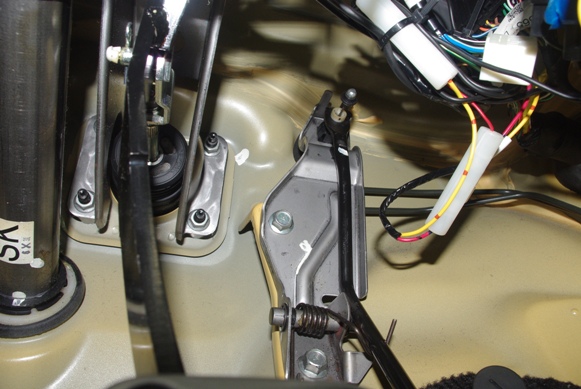 アクセルペダルユニットのブラケットをバルクヘッドにボルトで2箇所締め込んで固定します。