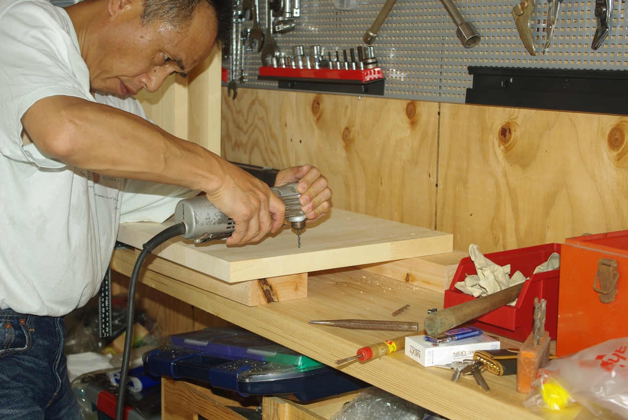 側板にコーススレッドで棚板を固定するための3oの下穴を開けています。