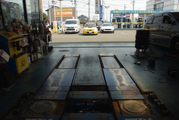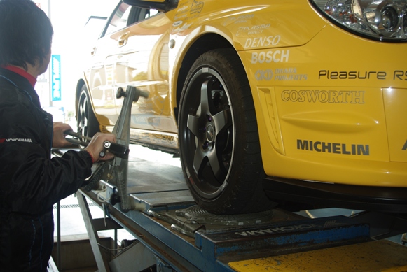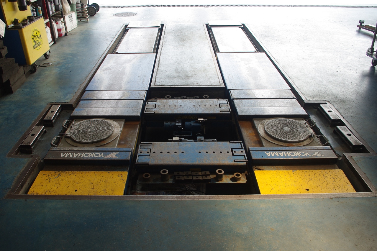リフトにフロントホイールのアライメント調整をするため、タイヤがスムーズに動くようターンテーブルがセットされました。