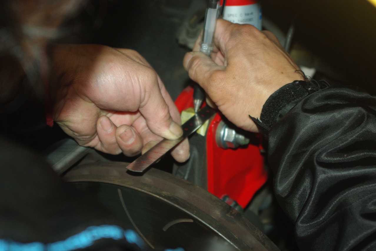 そこで先ほど測った数値を参考に、ブレーキローターの上を車体側に押しながら、キャンバーをネガティブ側に調整します。