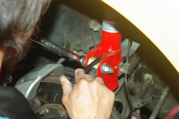 ストラットケースのアクスルハウジングブラケットを固定しているボルトナットを緩めます。