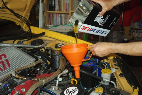 オイルレベルゲージのアッパーラインとロアーラインの丁度真ん中くらいになるよう慎重に入れました。