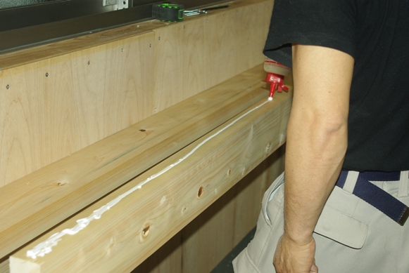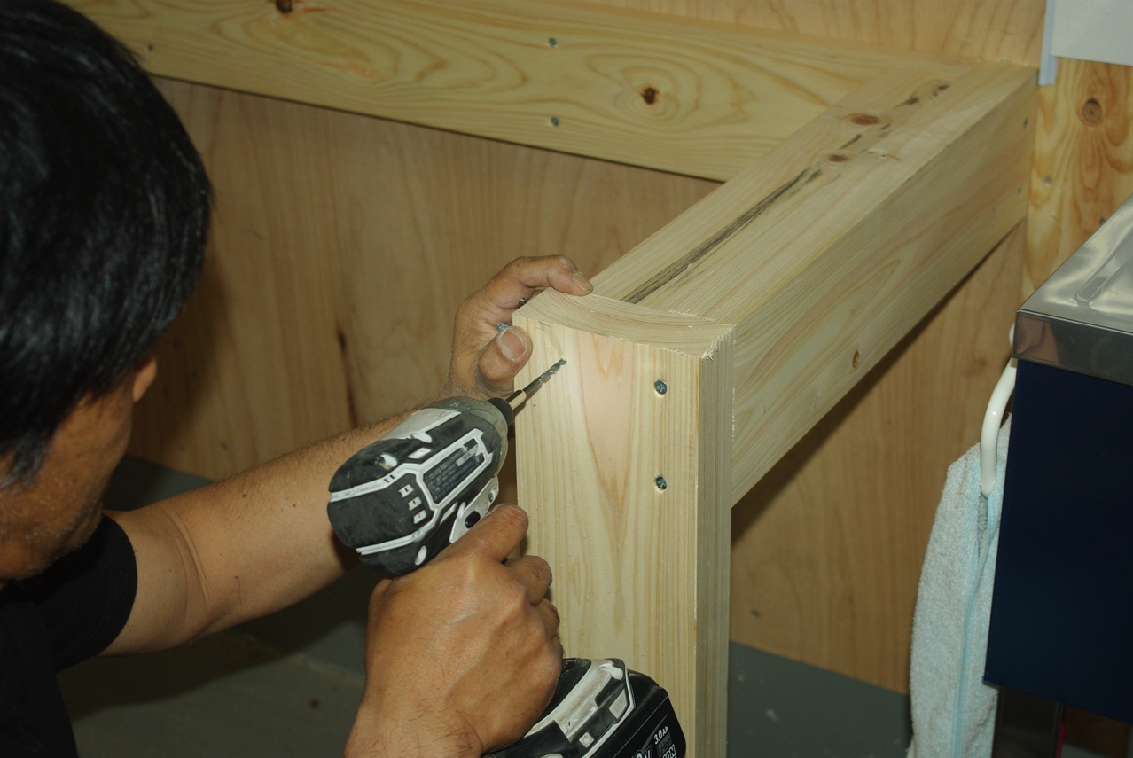 天板を裏からコーススレッドで固定するために、両端梁にこうして添え木を固定しました。