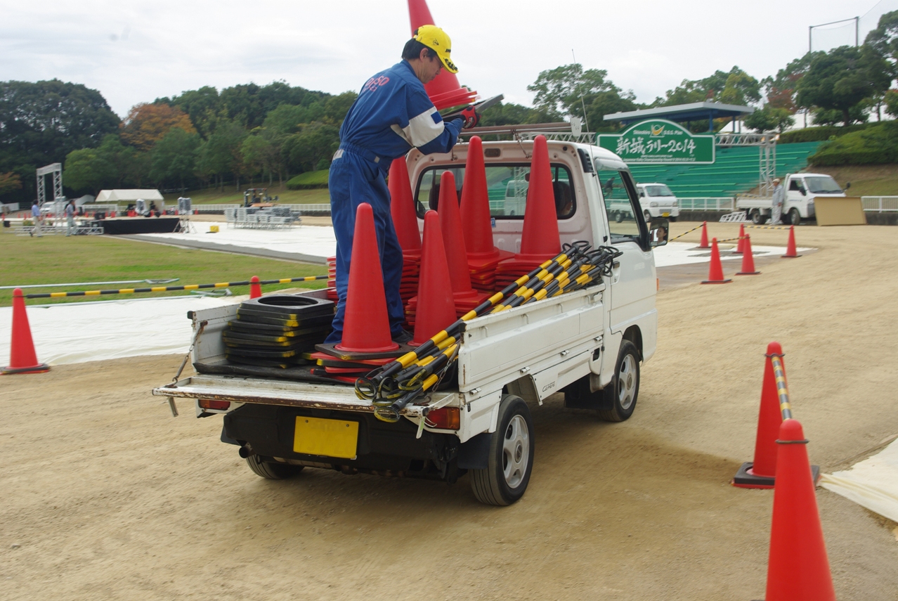 イベント担当の大岡組の主な仕事は、デモランなどのコースの目印となるコーンとコーンバーの設置です。