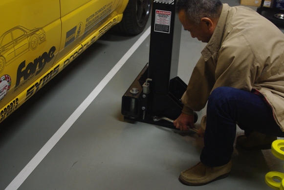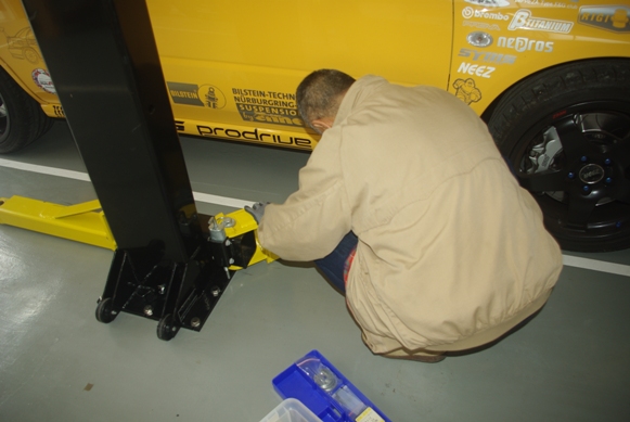 リフトの受け台を、クルマのジャッキアップポイントに合わせる作業です。