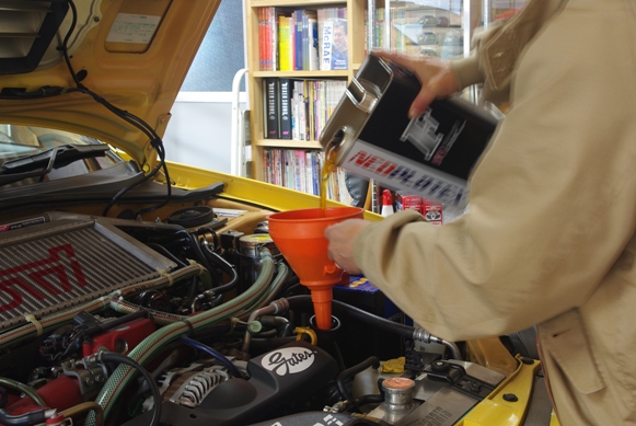 専用の漏斗を使って、オイル缶から直接給油するようにしています。