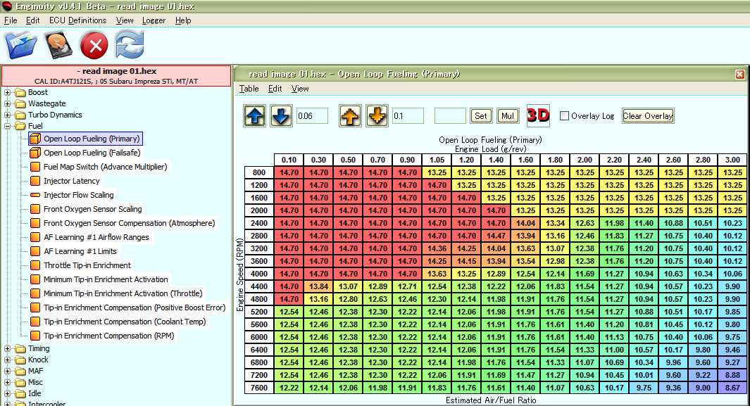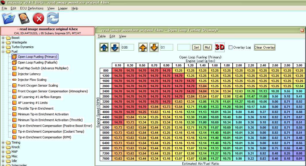 ECUの各項目ごとに、DATAマップを比較していく内に、Fuel項目のOpen Loop Fueling(Primary)マップの縦軸の一番上、エンジン回転数800回転で、横軸のエンジンロードが一番左0.1g/revから、0.3、0.5、0.7、0.9g/revと5つのセル内の数値で、ノーマルDATAと書換DATAの数値に著しい違いがあることを発見しました。