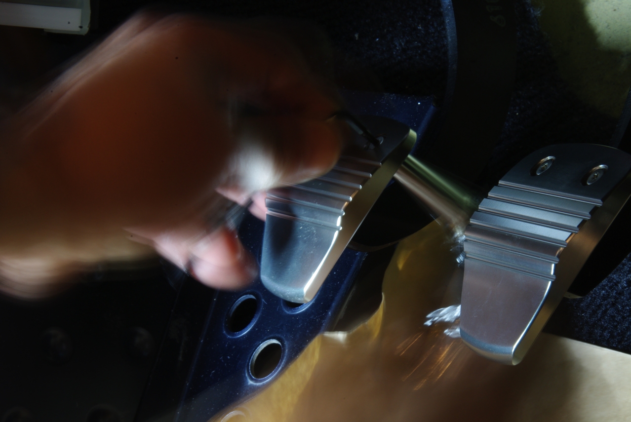 ブレーキペダルNEOをブレーキ(クラッチ)ペダル本体に合わせて、ボルト穴の位置をけがきで写し取っています。