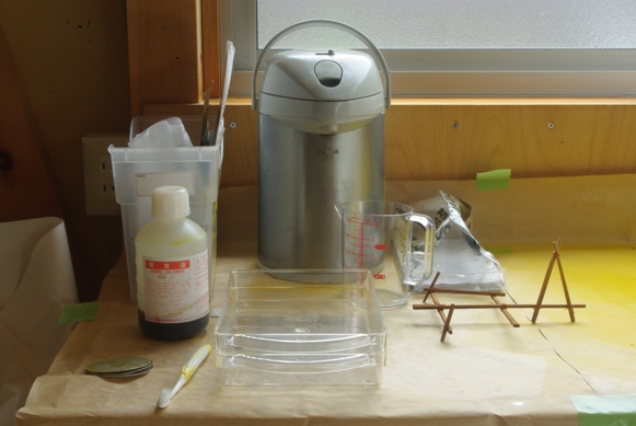 因みにこのバットとして使っている冷蔵庫用汎用トレイは、最初から2コありますので、使用済みの腐蝕液の入ったバットはそのまま屋外に移動させて、ガレージ入口脇のコンクリート敲きの上に置いて、消石灰を投入してそまましばらく放置して置きます。