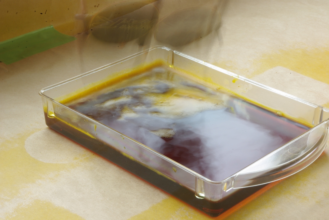 バットに熱湯を移して腐蝕液を稀釈すると同時に、設定温度も一定に保ちます。