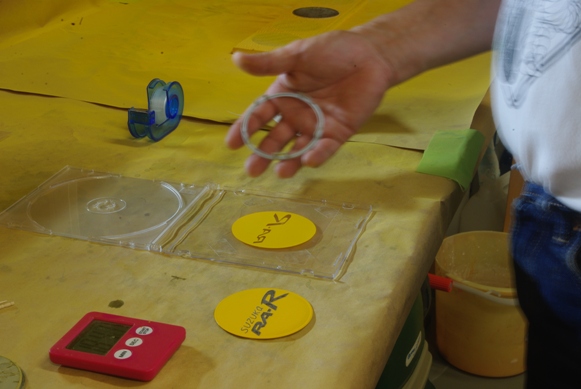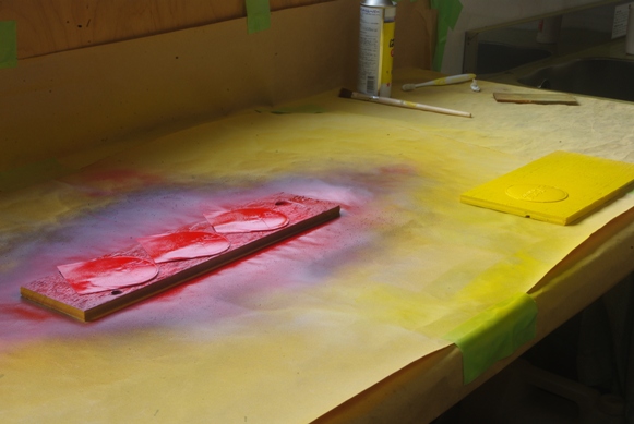 ここでまた、例の「マスキングシート精密貼り込みツール」を使用して、アルミレンズ裏面にマスキングシートを正確に貼り付けます。