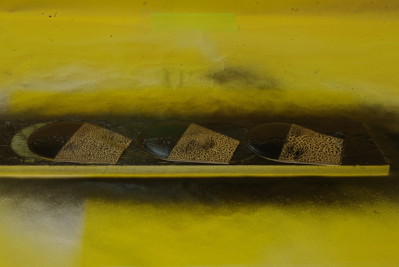 図らずも背景の塗装の黄色とマスキングシートの黄色がとても似通っているために、ちょっと見ただけでは判別しにくいと思います。