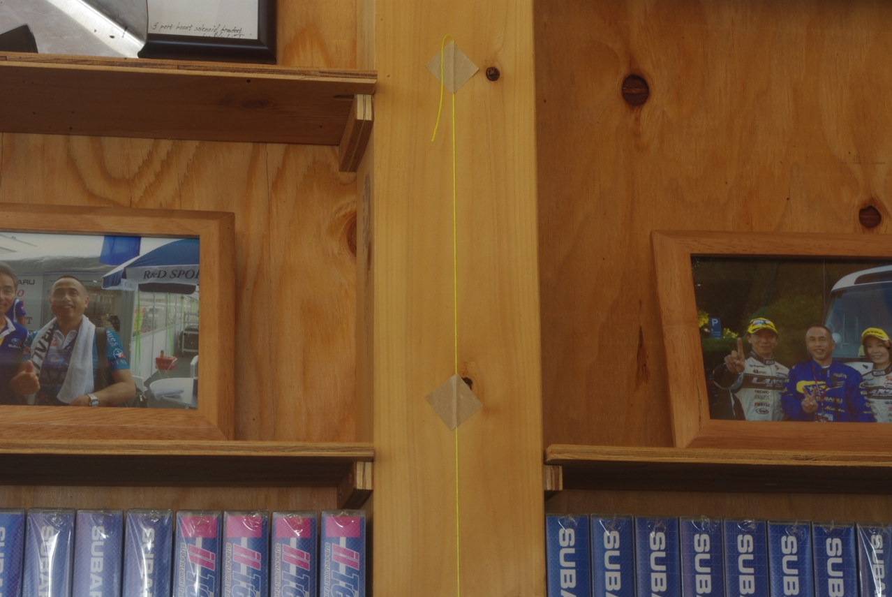 まず所定の柱に、水糸にラチェット用プラグをぶら下げて簡易の下げ振りを作って貼付、垂直のマーキングを行いました。