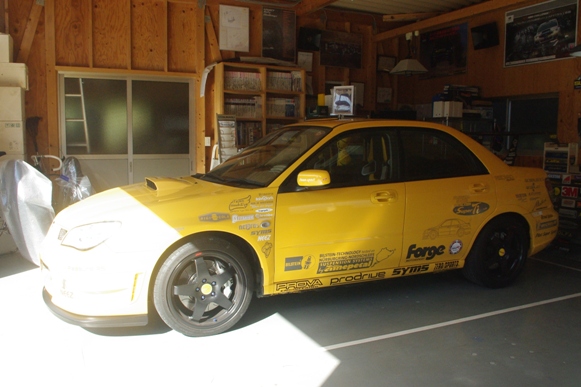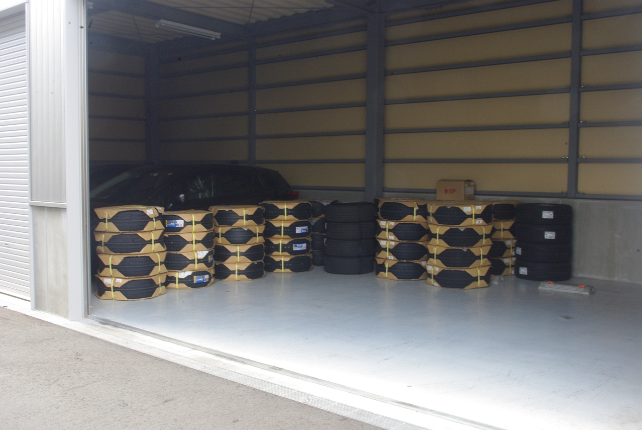 ショールームの裏手側に回ってみると、そこに別棟のこじんまりとした車庫があり、扉が開いてましたので中をうかがいました。