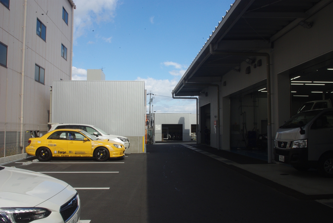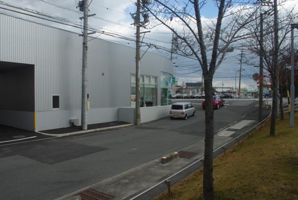 広い駐車場の敷地の一番北西の端っこから、ショールームを望みました。