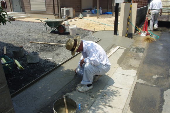 今日は朝から好天に恵まれ、自宅解体の際に取り外した門扉を取り付けるために、門扉の基礎工事が実施されました。