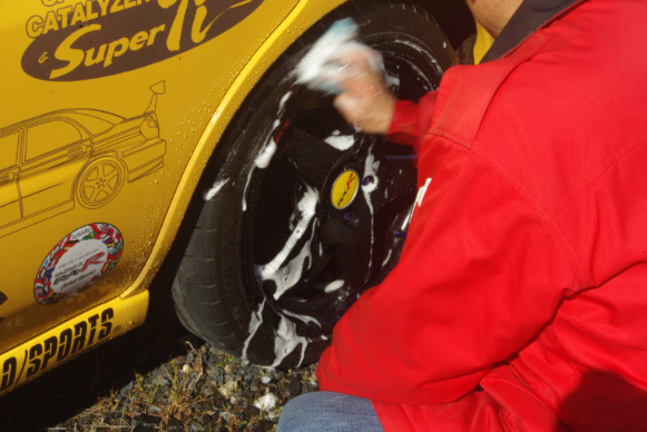 一度洗浄した後、必ずクルマを1mほど動かしてから、再度キャリパーに阻まれて手が入らなかったホイールの内側部分の汚れを落とします。