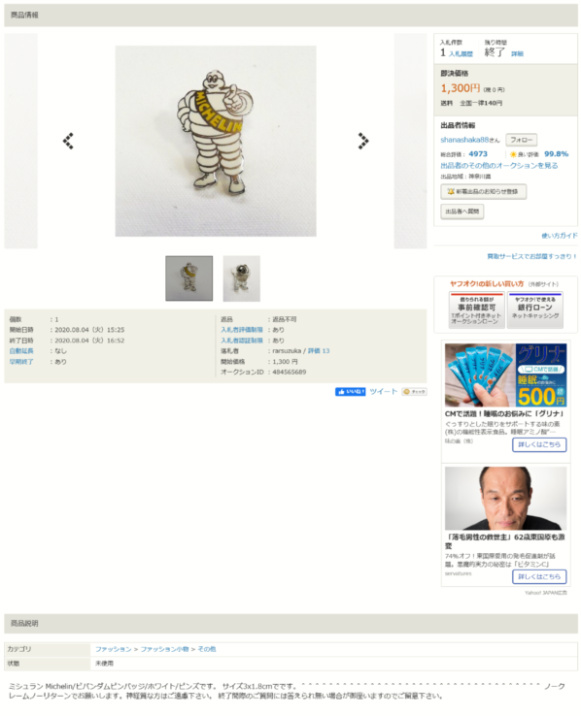 このピンズの出品者の方は、商品の紹介はほとんどありませんし、Bibendumのポーズもちょっと月並みではありましたが、ピンズとしての出来具合はとても良く、ディテールもしっかりしている綺麗なピンズだと思います。