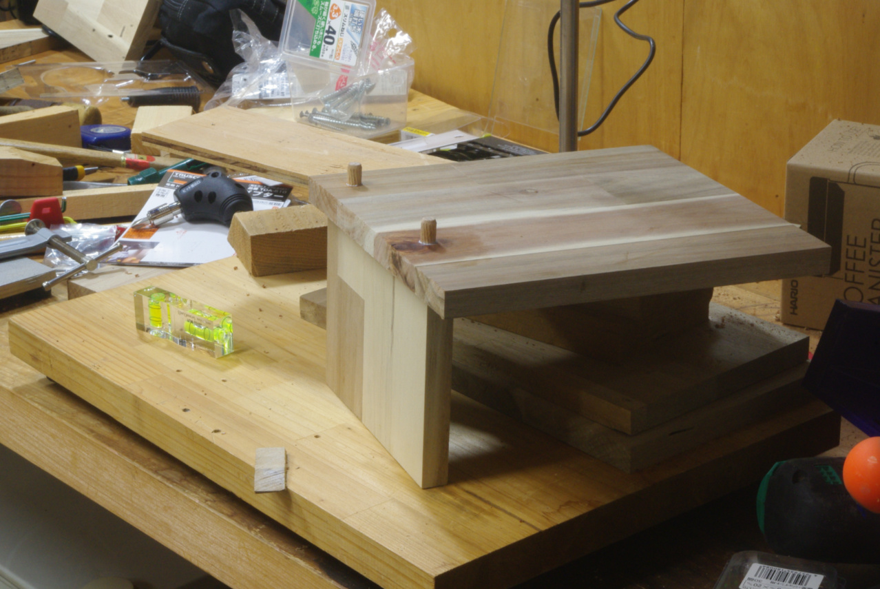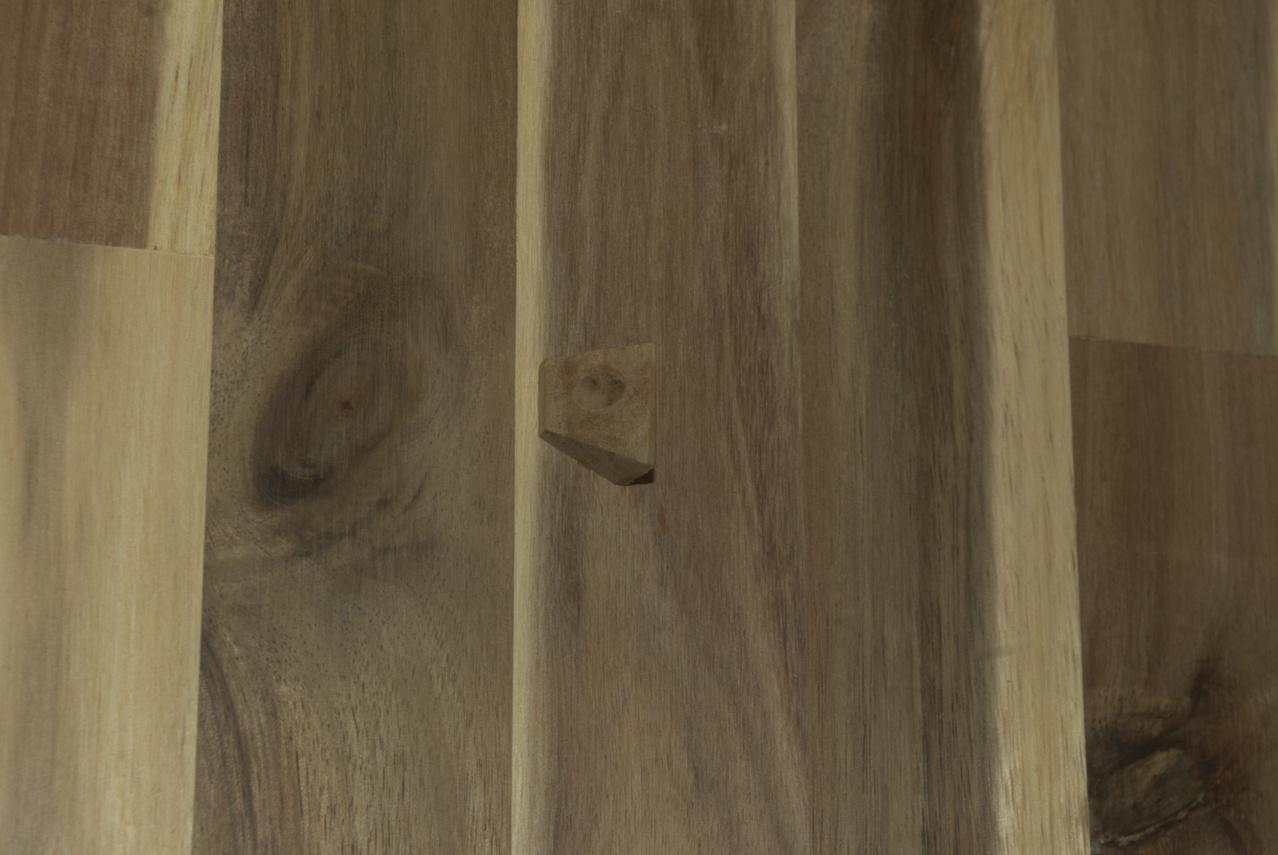 設置は小径のビスで固定しまして、ネジはご覧のように隠しネジ穴を設け、さらにそのネジ穴は同じアカシヤ材から削り出したダボ材で完璧な隠しネジ仕様にします。