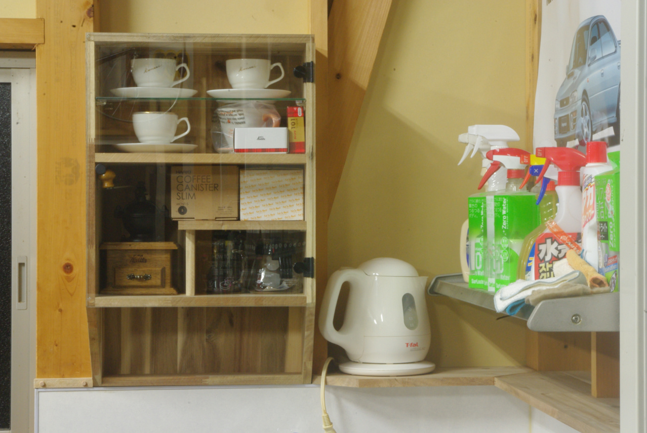 そしてこのことによりまして、この棚に並べて収納しておりましたコーヒーミルと電気ポットのうち、電気ポットを新設しました側の造付けオーダー棚に移動しております。
