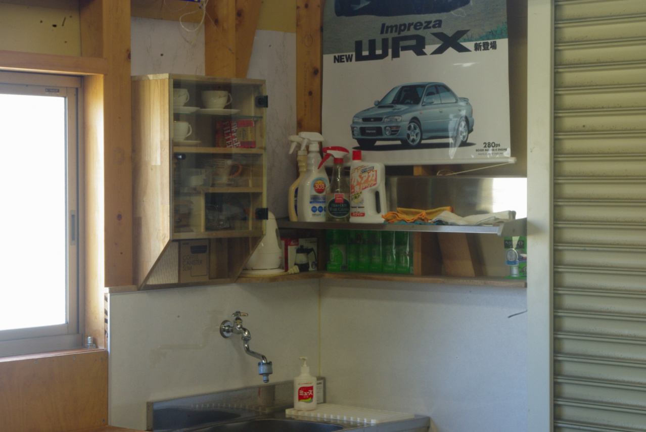 アールエーアール鈴鹿のガレージの内装は、打ちっぱなしのコンクリートのように材木やコンパネ等建材の素材そのものの良さを前面に打ち出したものが基本ですが、この流し台コーナーだけは⑯業務用シンク設置と給排水設備 を導入しました当初から、実用性を重視しましてアイカセラールというメラミン不燃化粧板を一部の壁に施工してました。