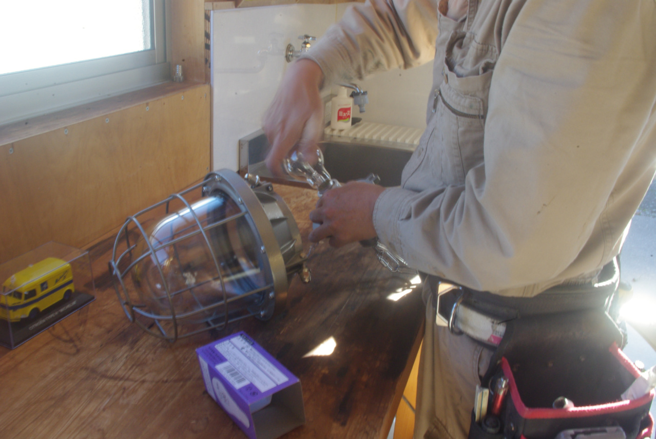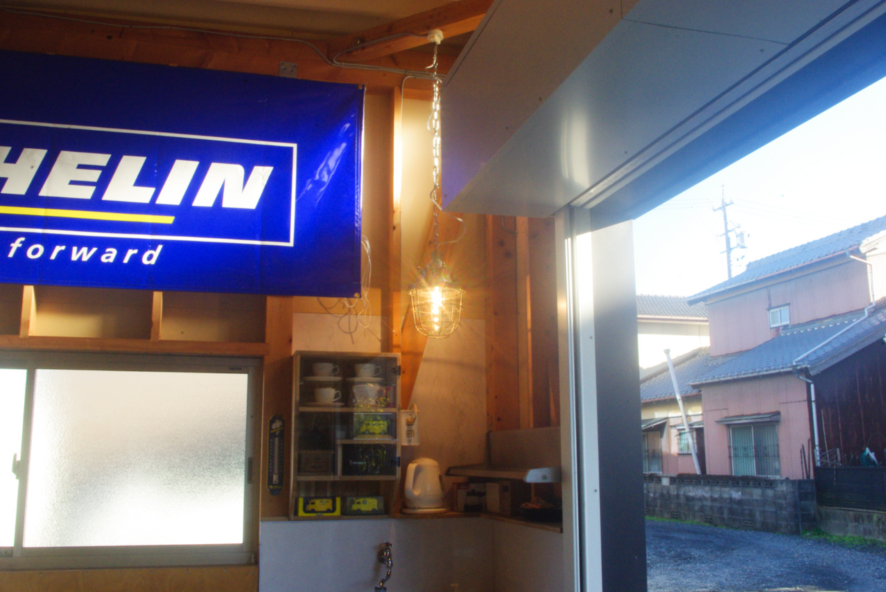 それでは何故、まるで軍艦や潜水艦を想起させるような見るからに無骨でインダストリアルなデザインの照明にしたのかと申しますと、実際にこのアールエーアール鈴鹿が後に「シトロエンコーナー」と命名までしました業務用のオールステンレス流し台を中心としたガレージコーナーの天井に吊すにはベストマッチの照明器具だからです。