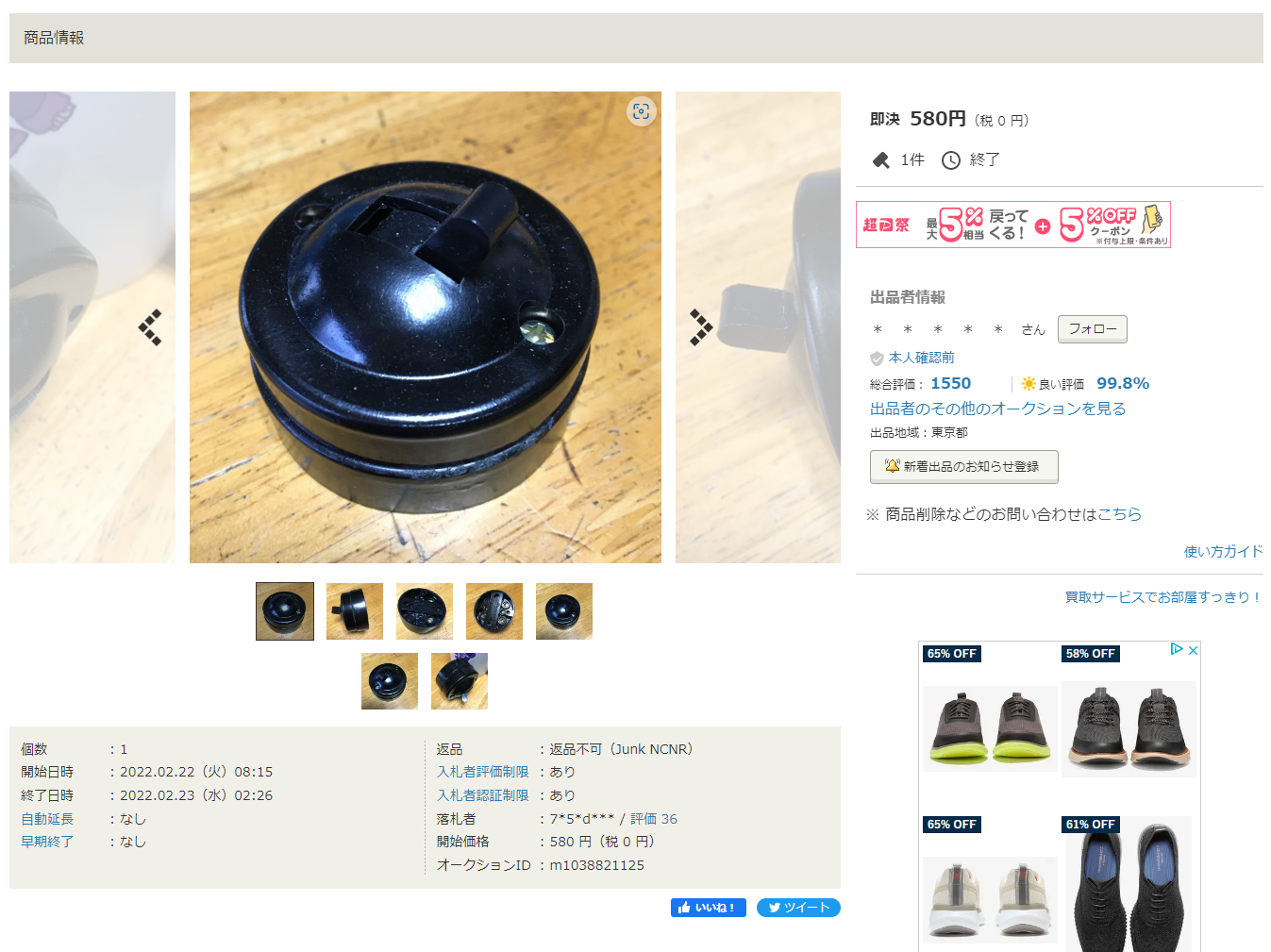 この日にヤフオクにてアンティークなこのベークライト樹脂製の壁スイッチを注文しました。