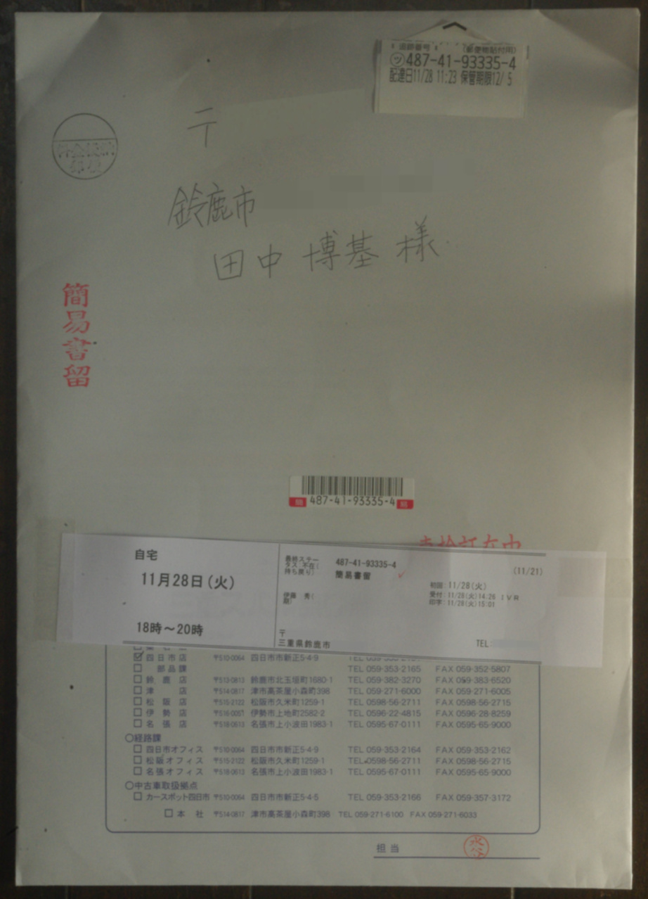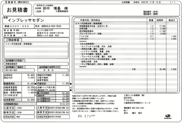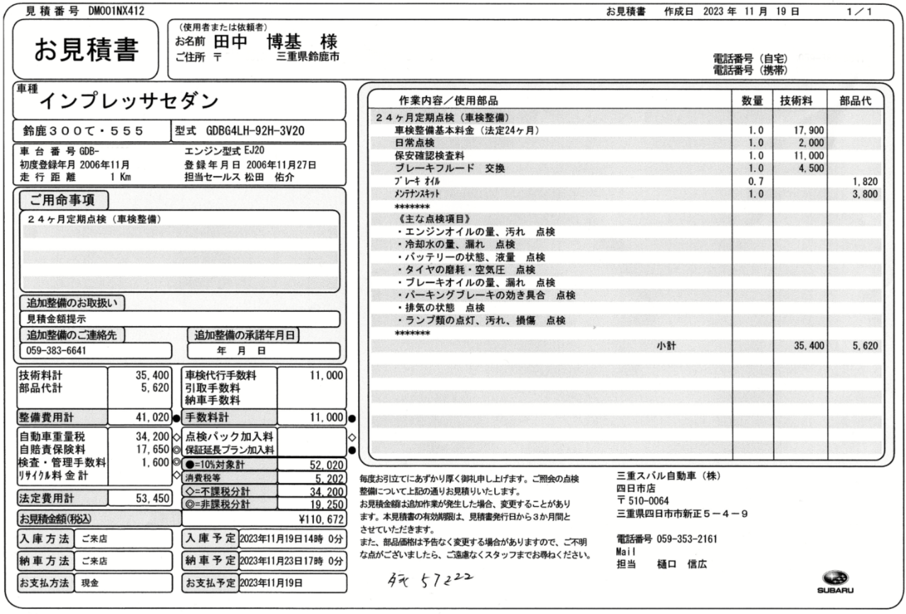 本日電話にて予約しておりました車検の愛車入庫のため、三重スバル四日市店を約束のPM14:00に訪れました。