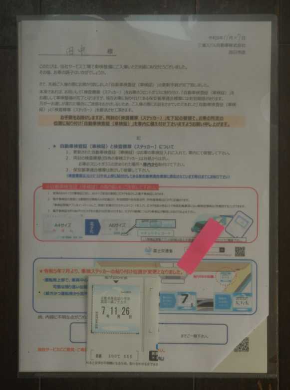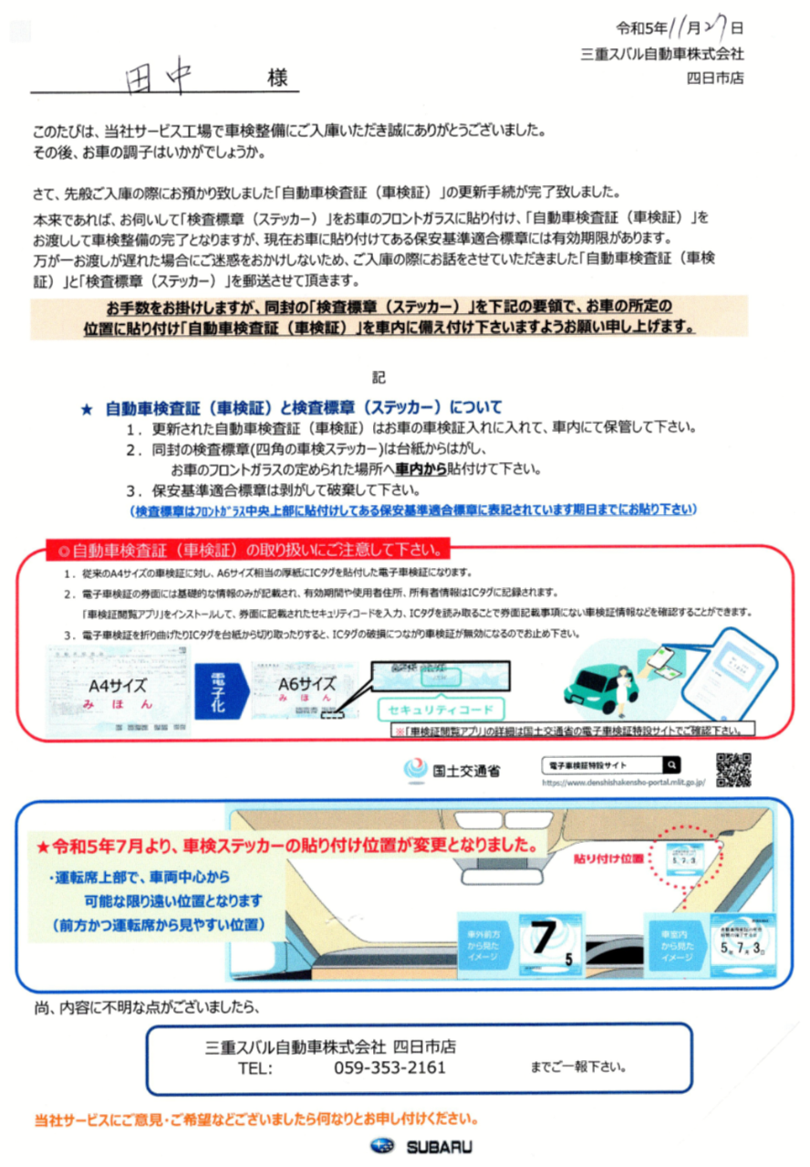 これが車検証と車検標章ステッカーについての三重スバルからの説明書です。
