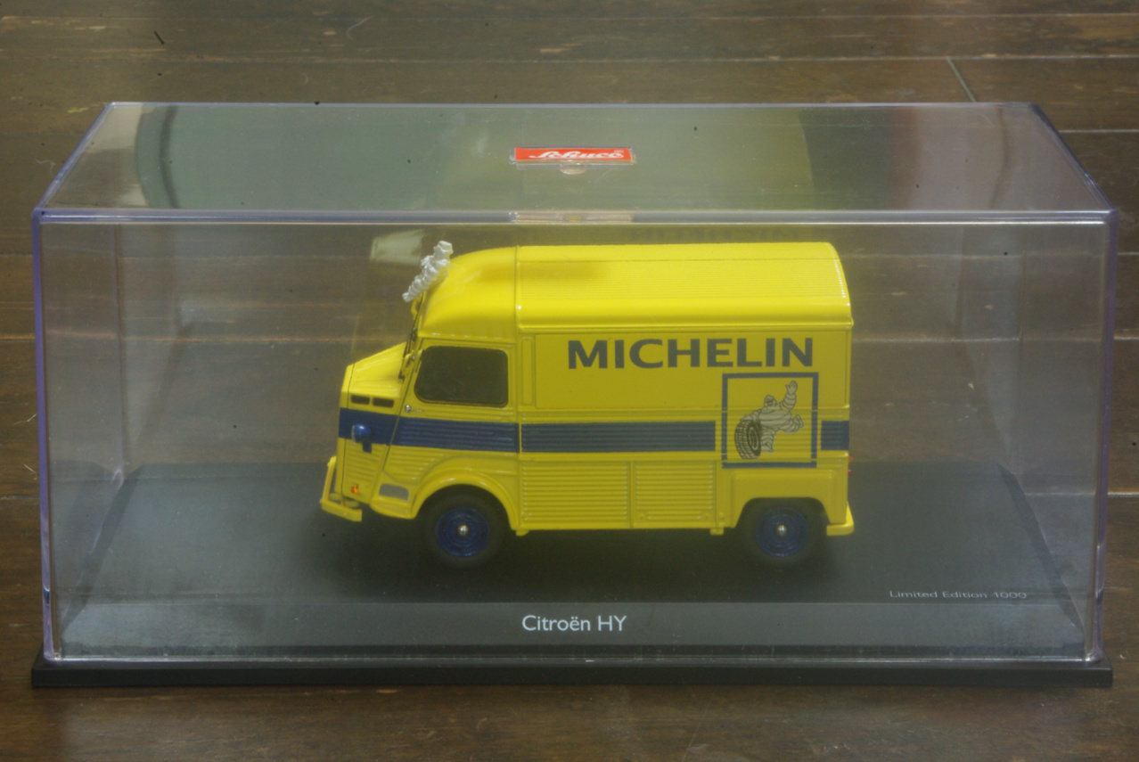Citroen HY Kasten Bj. 1948-1981, Michelin-Lieferwagen, Schuco-Modell IN M.1/43のディスプレイケースがかなり大きいので、ここに飾るときには少しレイアウトに気を遣いましたが、何とかバランス良く収まりました。