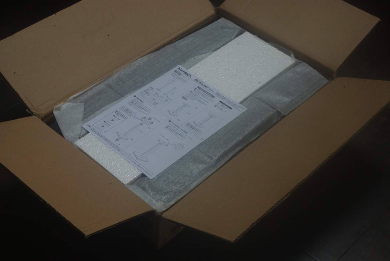 梱包のダンボールを開けて上面の緩衝材を取り去ると、エアーキャップシートに包まれた商品のスピーカーが現れました。