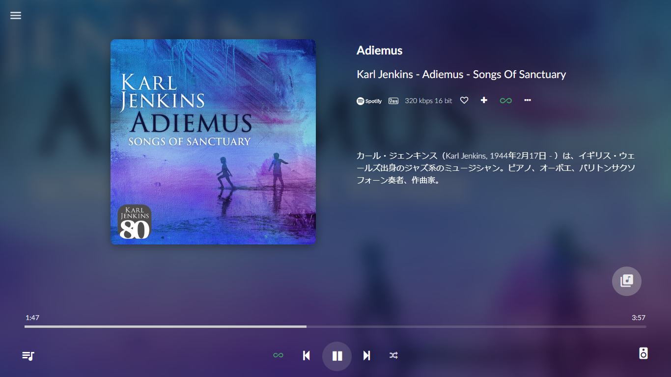 さらに左のスクショにありますように、CDジャケットの画像とともに、楽曲のタイトルや作曲者の紹介が素敵な画面とともに映し出されます。