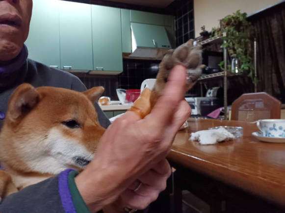 お約束の散歩後の肉球ケアの最中のワンショット!