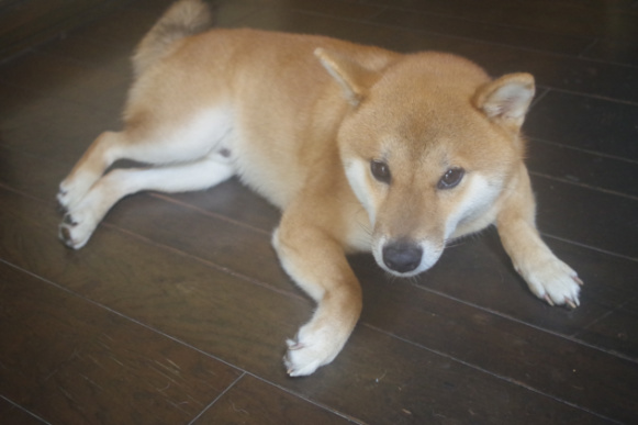 相変わらず床に寝そべって…