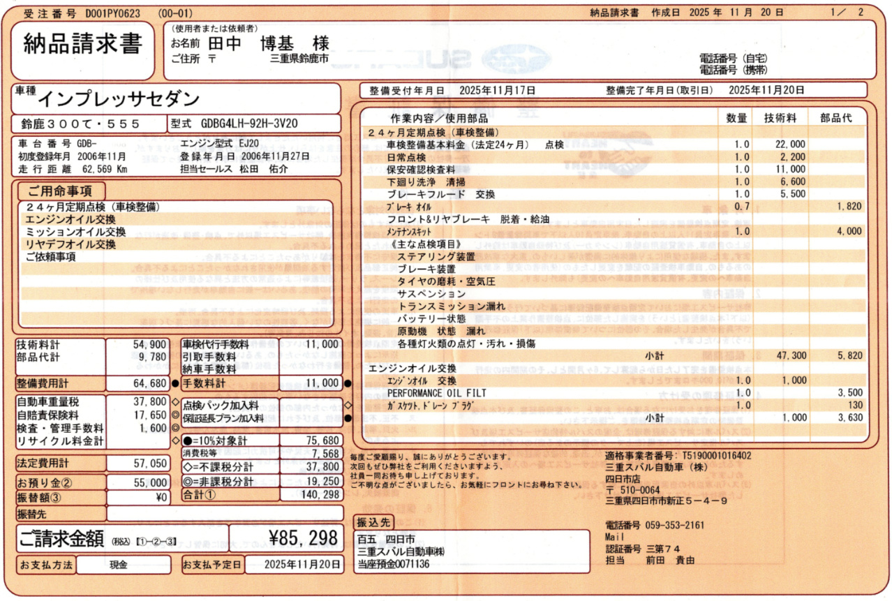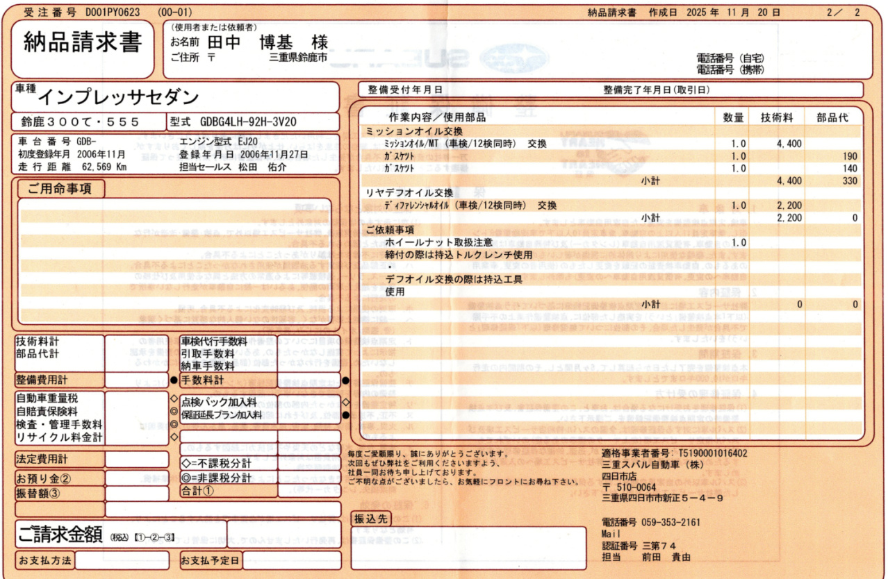 2枚目の書類には持ち込みのエンジンオイルとMT、デフオイル交換の作業代などが記載されていました。