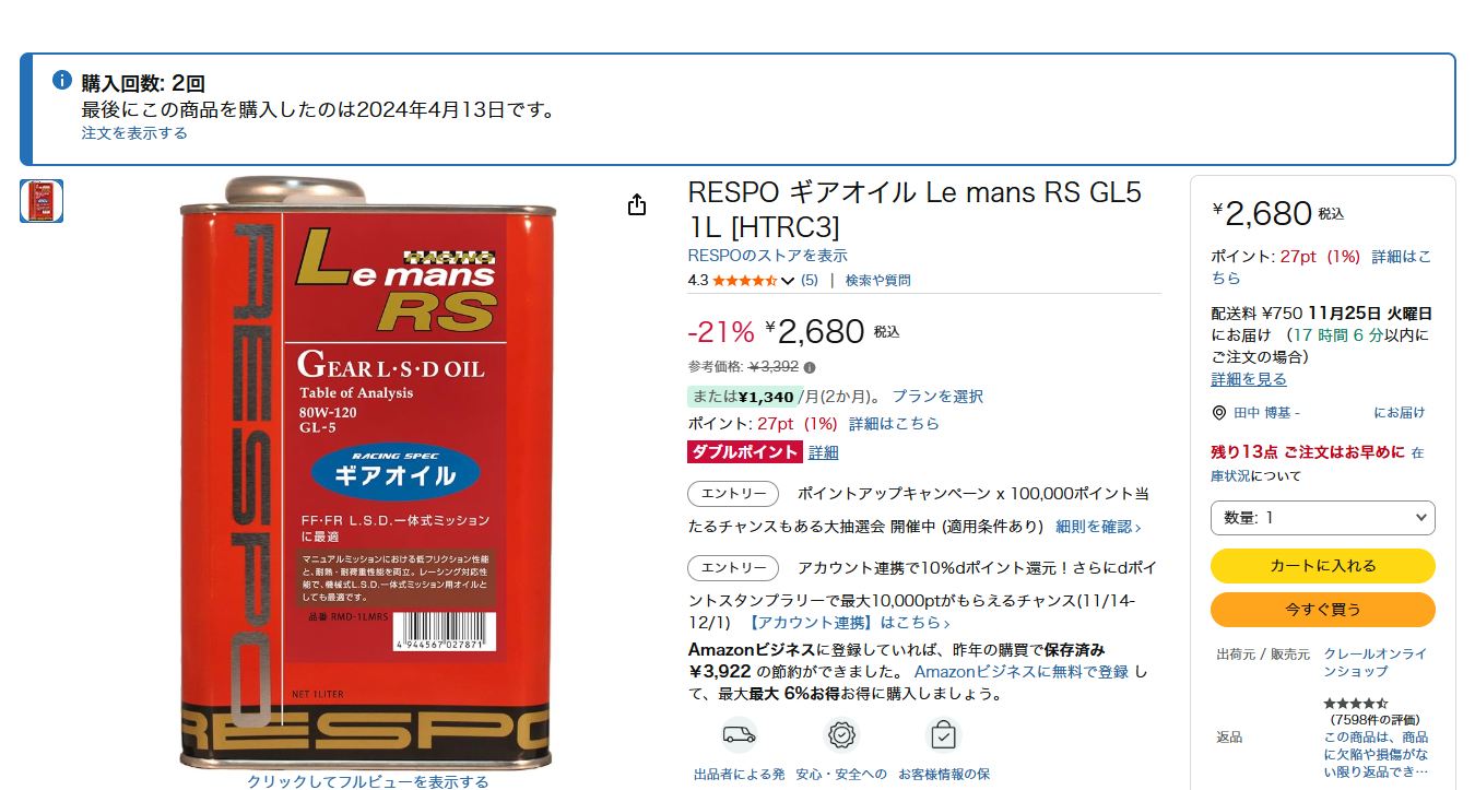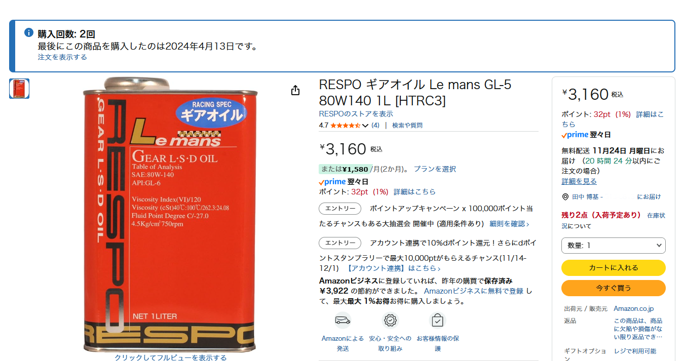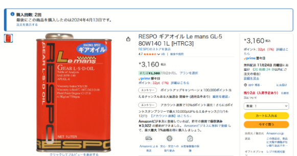 そしてさらに同日デファレンシャルオイル用に、上記と同じく