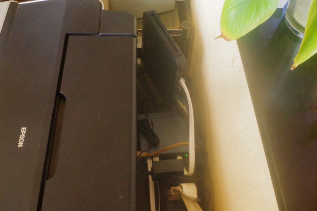 この日に写真撮影したものですが、ご覧の通り自宅の居間にあるEPSON PX-5600 という前時代じみた巨大なプリンター背後の狭いスペースに、このバッファローのAirStation WSR-1800AX4-KH を設置しています。