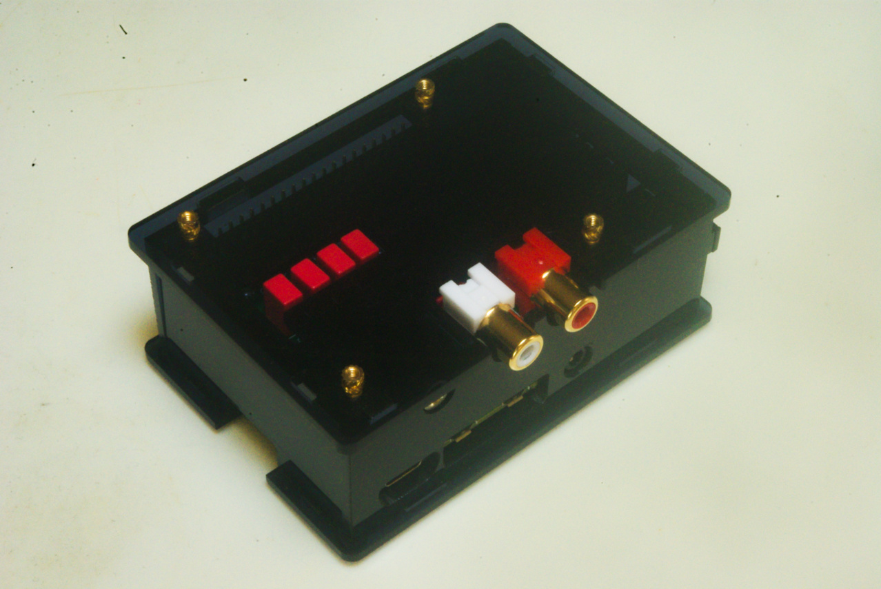 Raspberry Pi 4 model B + inno HIFI DAC module I2S インターフェース ネットストリーム オーディオ プレーヤー を、まさにそのフォルムから格納されている内容物のパフォーマンスが推察されるような美しい機能的な黒色半透明の所謂ダークスモークカラーの、ただアクリルパネルを組み合わせただけのシンプルかつとても美しいその中に収まる
