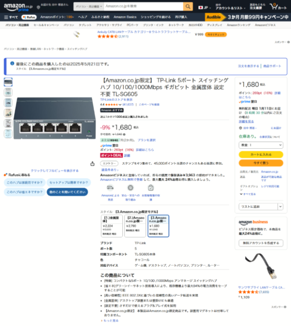 上記のスイッチングハブが左のTP-Link 5ポート スイッチングハブ 10/100/1000Mbps ギガビット 金属筺体 設定不要 TL-SG605です。
