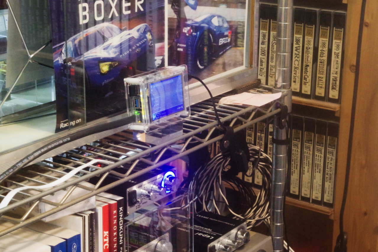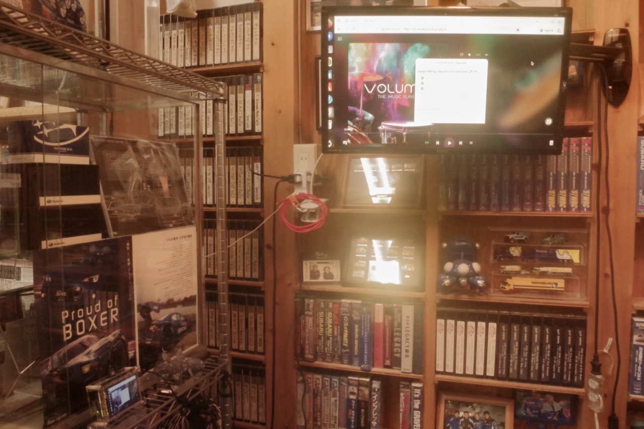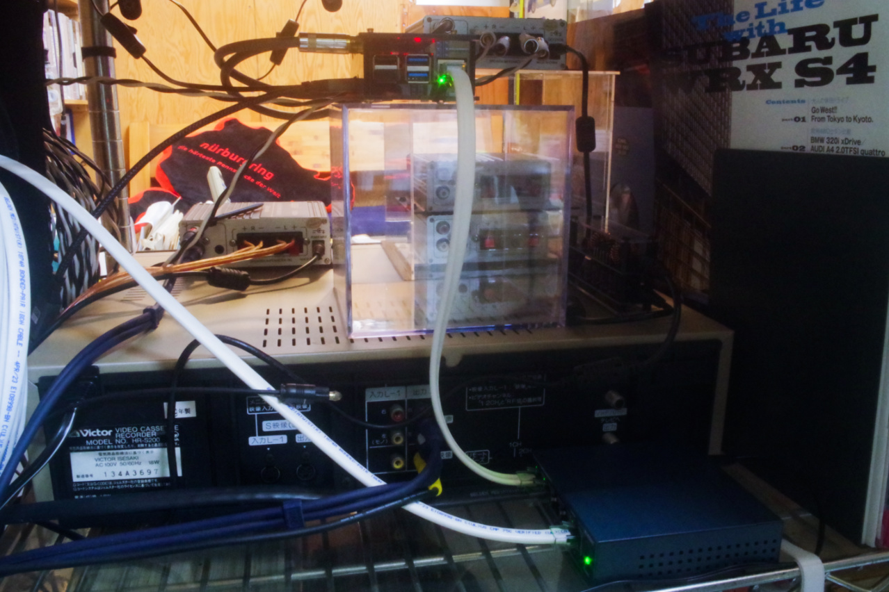 まず一段上の棚にはOsoyoo 3.5inch monitor + Raspberry Pi 4 model B 4GB PC のデバイス、そして元々このスペースはこのために確保したようなものですが、一番下にまるで舞台のように横たわる、Victor HR S200 S-VHSビデオデッキがあります。
