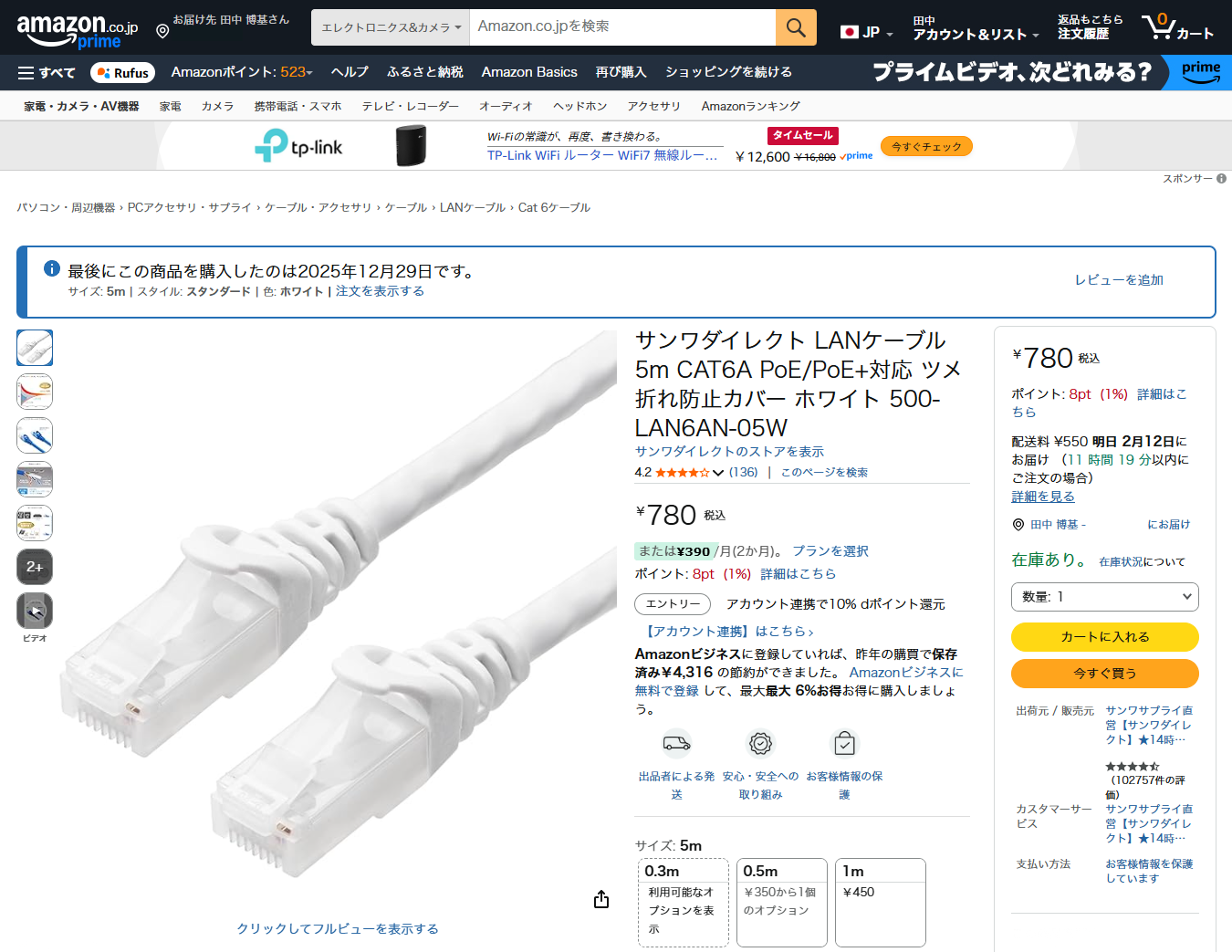 以上4つの具体的な提案を受けて、自身で再考した結果、まず1.の提案は予算の点で却下、3.と4.については私の提示している条件外ですので除外、残るは2.だけですので、ガレージだけのWi-Fi設置ならコスパ最強、PoE給電にも対応可能と云う文言が一番刺さったひとつ目の提案に従ってTP‑Link EAP110 Access Pointを購入することにしました。