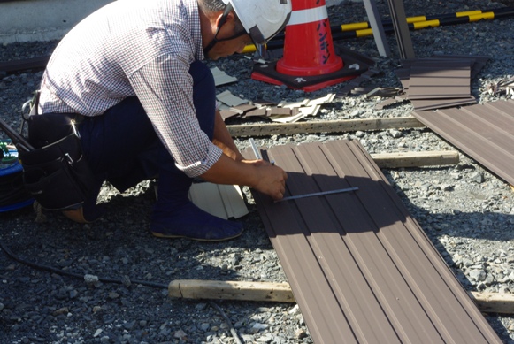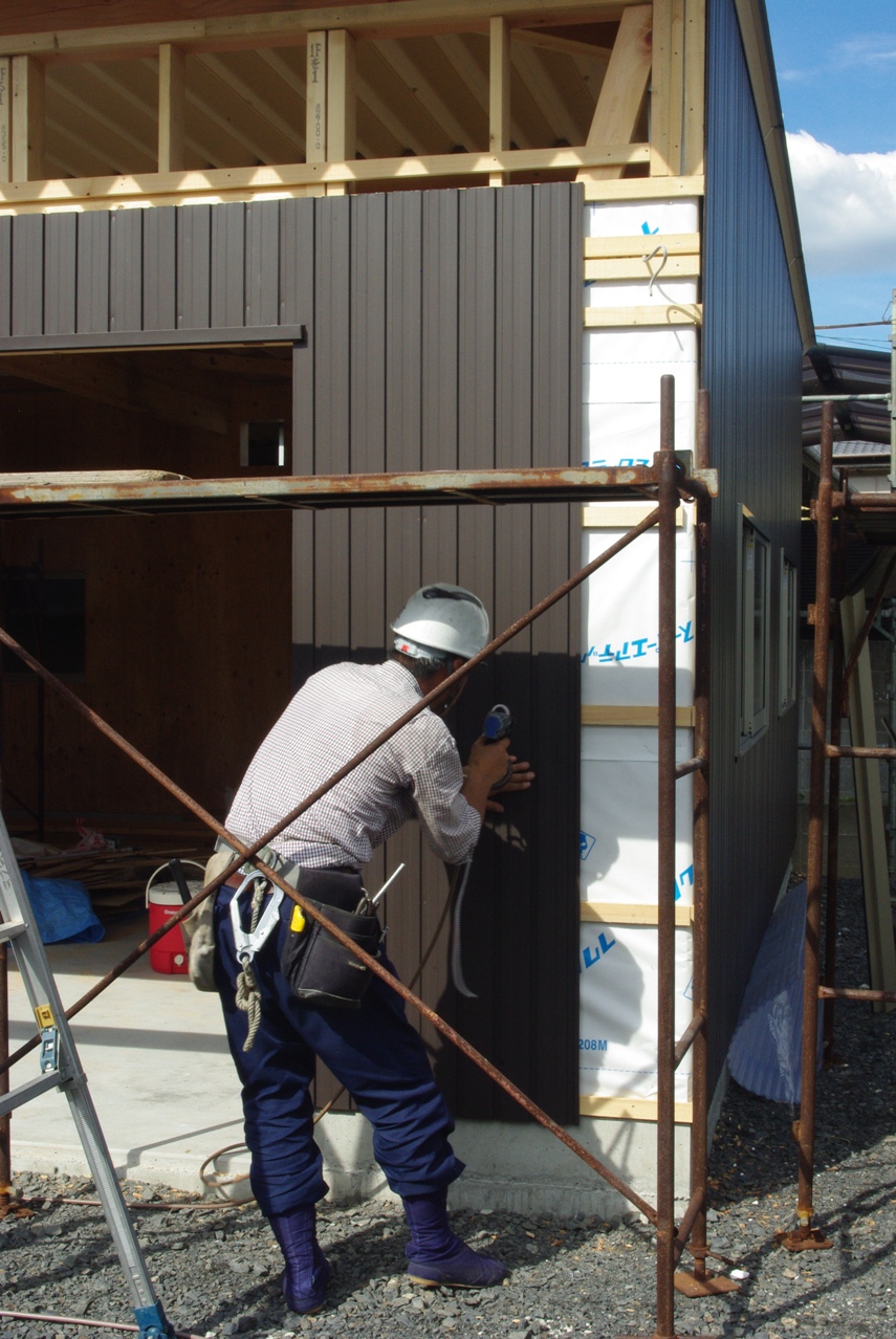 微妙な鉄板の反りや歪みを絶えず修正しながら、胴縁に合わせて位置決めをし、正確に打ち付けていきます。