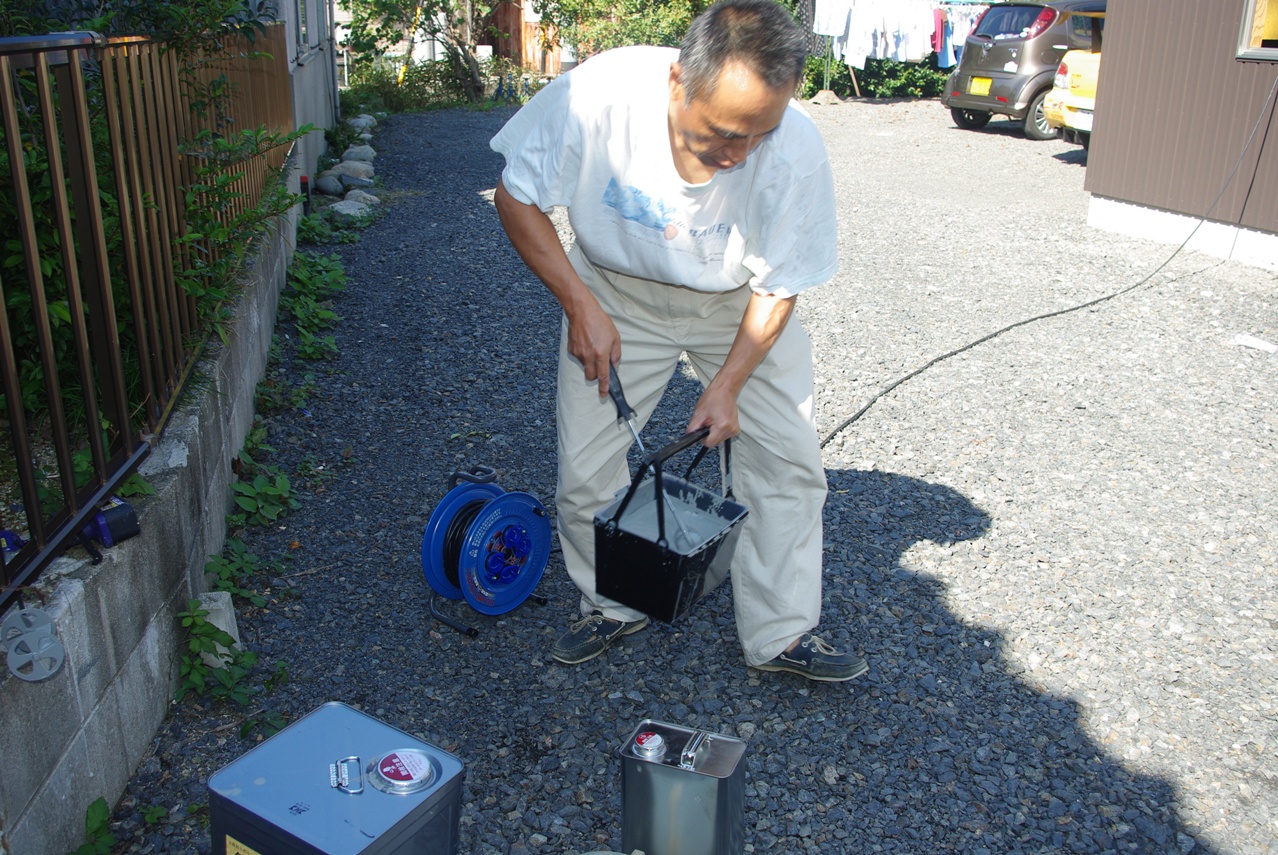 昨日師匠のペンキ屋さんから伝授していただいた要領に従って、塗料を混合し撹拌するわけですが、今回は昨日の経験から塗料液3.5gに対して、約466ccの硬化液を混合して充分に撹拌した後、約200ccのアクリルシンナーを加えて再度充分に撹拌しました。